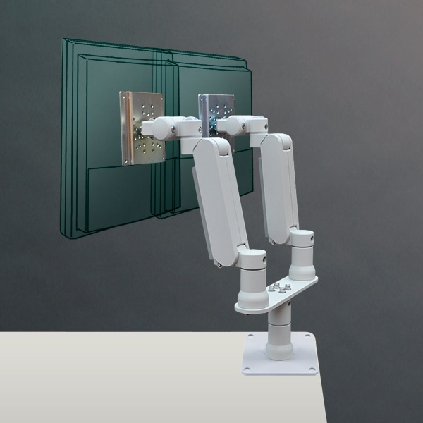 Vシリーズは標準アームに支柱ユニットを増設しています。下記三種類の装着用ブラケットにネジ4個で取り付けられる専用アームです。 V-WP(並行設置型強化クランプ)、V-901(並行設置型卓上取付型)、V-TD(垂直2段置型大型クランプ)