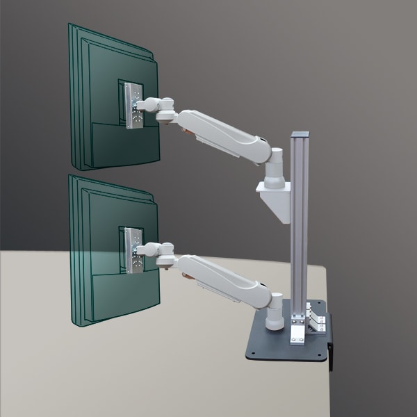 Vシリーズは標準アームに支柱ユニットを増設しています。下記三種類の装着用ブラケットにネジ4個で取り付けられる専用アームです。 V-WP(並行設置型強化クランプ)、V-901(並行設置型卓上取付型)、V-TD(垂直2段置型大型クランプ)
